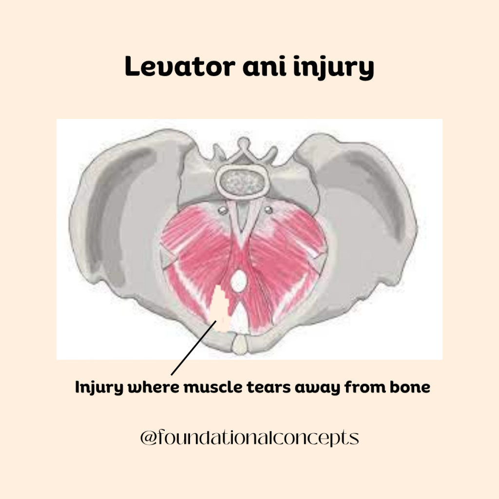 The levator ani is a group of muscles that forms the main support of the pelvic floor. These muscles support the bladder, uterus, and rectum, help control urination and bowel movements, and work together with the deep abdominal and back muscles to stabilize the spine. During vaginal childbirth, part of the levator ani muscle can detach from the pelvic bone. This is called a levator ani avulsion or defect. Levator defects are strongly associated with pelvic organ prolapse, a condition in which the pelvic organs drop downward and press into the vaginal wall. While this structural injury can affect pelvic support, it does not automatically lead to low back pain.